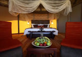 Номера обставлены мебелью из кожи и темного дерева и замшевыми лежаками.