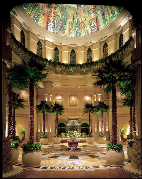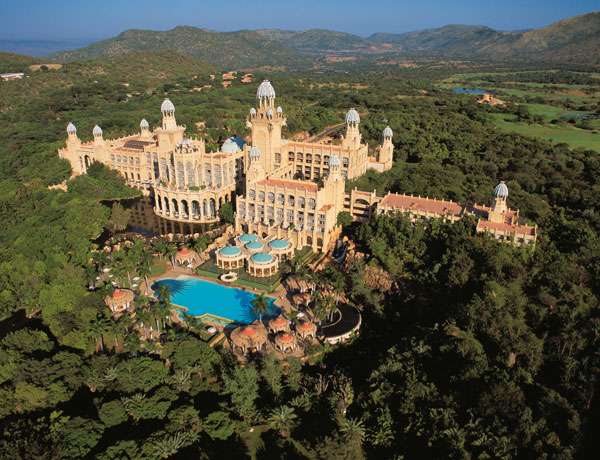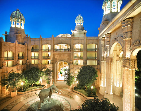The Palace of the Lost City (Дворец Затерянного города) бесспорно является одним из лучших отелей комплекса Сан Сити. Его название точно передает саму суть – «Дворец». Во внешней архитектуре Дворца доминируют высокие башни, фигуры животных, выгравированные в камне и слоновьи бивни. Отель окружает 25 гектаров ботанических джунглей с многочисленными дорожками, каскадами, озерами, бассейнами и более полутора миллионами различных растений, деревьев и кустарников. Вся флора делится на 4 основных вида: орнаментовый лес с экзотическими фруктовыми деревьями; влажный тропический лес, сухой местный лес и пальмовый лес рядом с бассейном. Во внутреннем дворике отеля находится бронзовая модель самого известного слона Африки – Короля Крюгер Парка – Шаву, отлитая в его натуральную величину (4,5 метра). Внутри отель поражает еще больше. Когда попадаешь в его огромный холл с высокими потолками (25 метров), то действительно оказываешься во дворце. Инкрустированное дерево, дорогие восточные ковры, пальмы, фрески, фарфор, резная мебель – все очень дорогое и очень изысканное. В ресторанах - серебряные приборы, картины известных современных мастеров. Вся мебель в номерах - ручной работы, даже двери и ручки выполнены вручную. Полы устланы дорогими коврами, сотканными по специальным заказам.