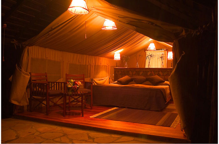 Комфортабельные палатки данной категории с видом на равнинные пейзажи заповедника декорированы в белых и кремовых тонах и имеют просторную кровать, кресла, гардеробную и рабочий стол. В ванной комнате две раковины, ванна, душ. Палатки имеют стеклянные двери и стол снаружи для ужинов на открытом воздухе и наблюдения за животными.