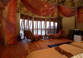 Номера обставлены мебелью из кожи и темного дерева и замшевыми лежаками.