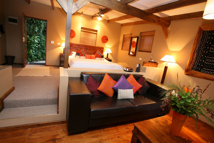 Отдельные коттеджи, расположенные в саду. В номере: спальная комната с кроватью king-size, ванная комната (ванна и душ), большая терраса с гамаком, гостиная. В декорации номеров использованы приглушенные коричневато-желтые и кремовые тона, а также африканские поделки. Вид на горы и леса.