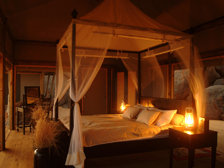 В каждом тенте: двухспальная кровать с балдахином и москитной сеткой, ванная, туалетный столик, веранда.