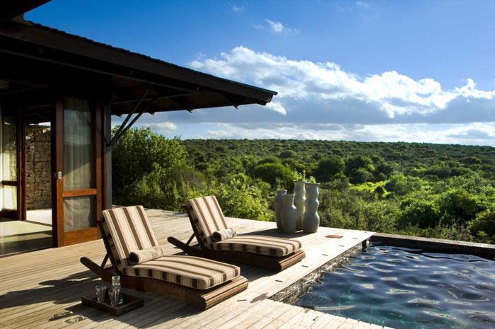 Выкиньте из головы классические представления о прошлой эре сафари, и олицетворяющих ее мужчинах с усами, в куртках-сафари, пробковых шляпах и носках до колена. Лодж Ecca очень современный и стильный. Закрыв все двери и шторы своего номера, Вы могли бы подумать, что очутитились в модном пентхаусе, только вот ночные звуки в Kwandwe - это не звуки машин и клаксонов, а вой шакалов и сумасшедший хор лягушек, доносящийся из зарослей вдоль реки Great Fish River. Этот живой и энергичный лодж в современном стиле - прекрасное место для знакомства с дикой природой для молодых душой.